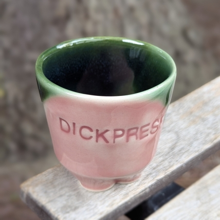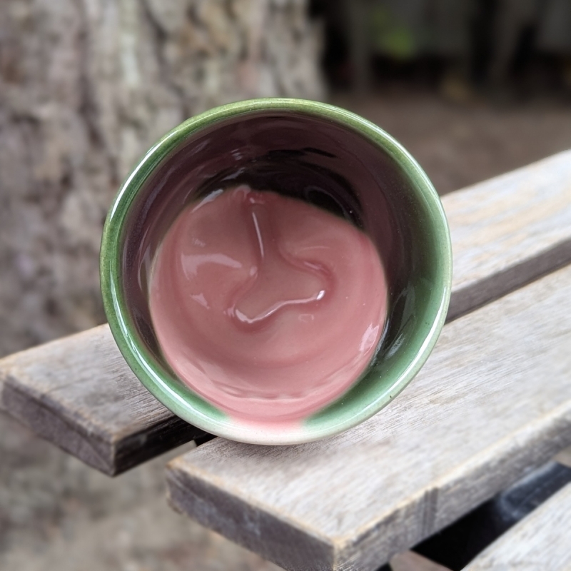 The cup is covered with green and pink glaze. Each one is unique, so the glaze pattern may vary slightly on your piece. The colors may be more or less intense in individual pieces- the charm of handicrafts.