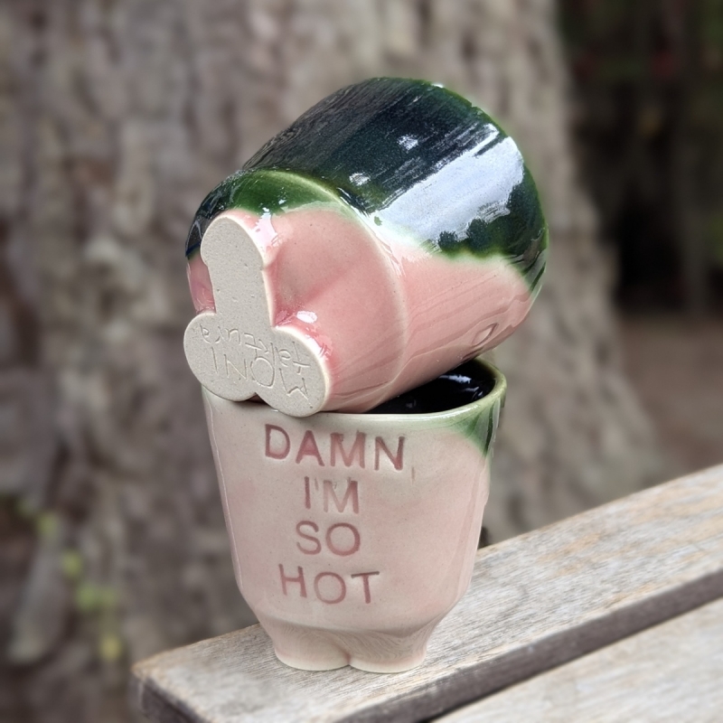 The cup is covered with green and pink glaze. Each one is unique, so the glaze pattern may vary slightly on your piece. The colors may be more or less intense in individual pieces- the charm of handicrafts.