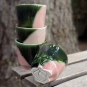 The cup is covered with green and pink glaze. Each one is unique, so the glaze pattern may vary slightly on your piece. The colors may be more or less intense in individual pieces- the charm of handicrafts.