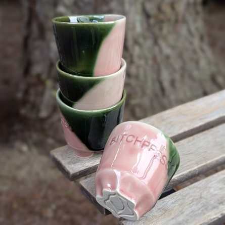 The cup is covered with green and pink glaze. Each one is unique, so the glaze pattern may vary slightly on your piece. The colors may be more or less intense in individual pieces- the charm of handicrafts.