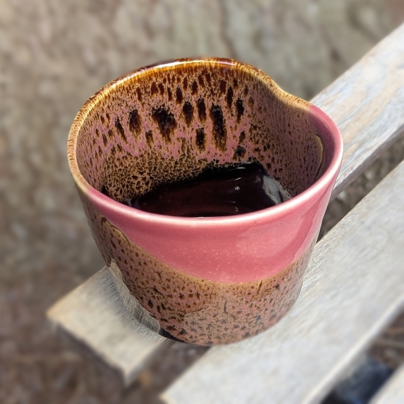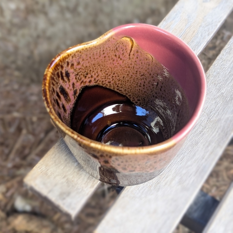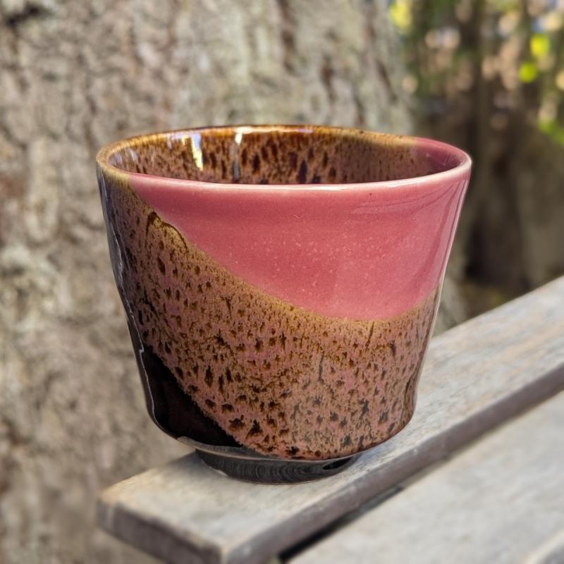 The cups are minimalist in form—trapezoidal in shape and comfortable to use. Beautifully glazed with pink and brown glaze, creating unique patterns. Each pattern is unique.