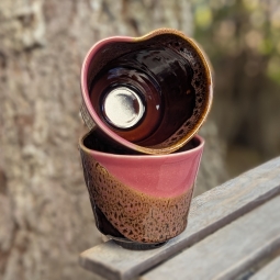 Ceramic cup with a delicate heart accent. The cups are minimalist in form—trapezoidal in shape and comfortable to use. Beautifully glazed with pink and brown glaze, creating unique patterns. Each pattern is unique. The cup is perfect for coffee, infusions, tea, but also drinks (because everyone...