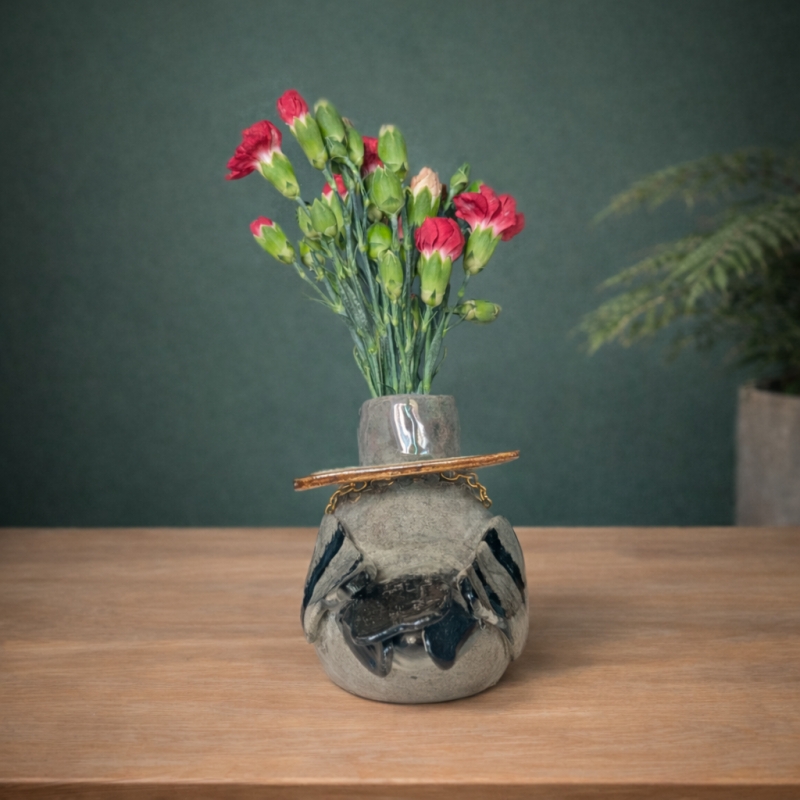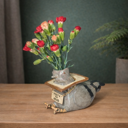 Hand-formed and glazed vase with my typical joke- I like wordplay and rhymes, which is why the pigeon proudly wears a “BREAD OR DEAD” necklace. The head, neck, and wing tips are covered with mirrors, which gives the effect of a delicate, rainbow glow.
