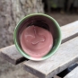 Czarka pokryta zielonym oraz różowym szkliwem. Każda jest unikalna, dlatego układ szkliw może się nieco różnić na Twoim egzemplarzu. W poszczególnych naczyniach kolory mogą być mniej lub bardziej intensywne- uroki rękodzieła.