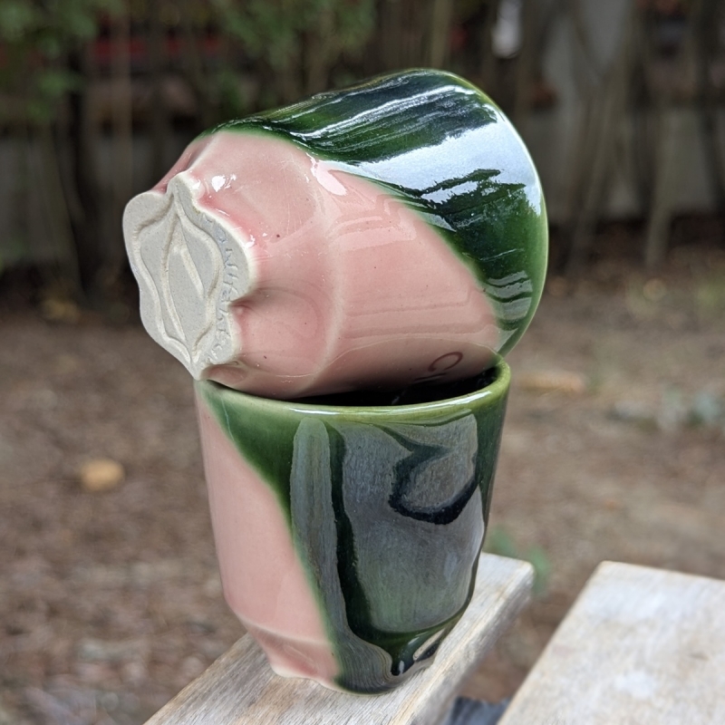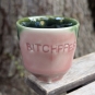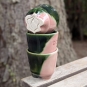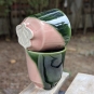 Czarka pokryta zielonym oraz różowym szkliwem. Każda jest unikalna, dlatego układ szkliw może się nieco różnić na Twoim egzemplarzu. W poszczególnych naczyniach kolory mogą być mniej lub bardziej intensywne- uroki rękodzieła.