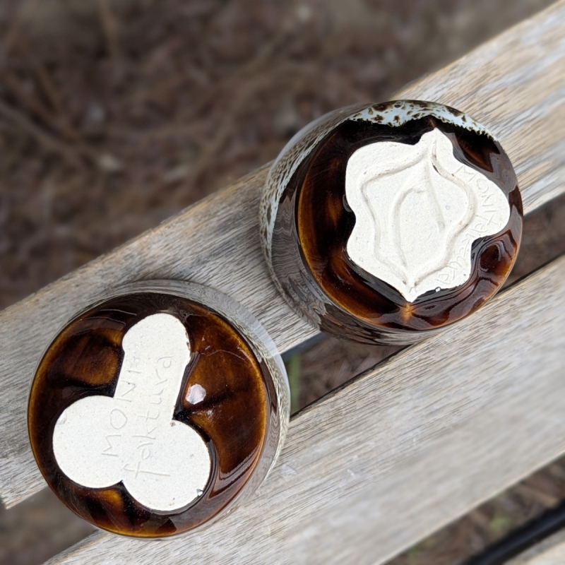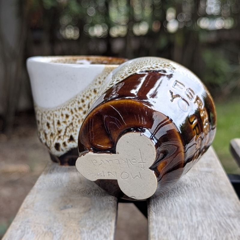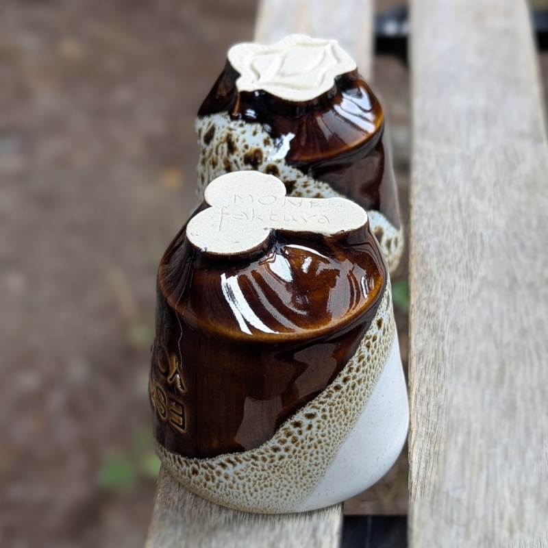 Czarka pokryta białym i głębokim brązowym szkliwem. To połączenie jest zachwycające. Każde naczynie jest unikalne, dlatego układ szkliw może się nieco różnić na Twoim egzemplarzu. W poszczególnych naczyniach kolory mogą być mniej lub bardziej intensywne- uroki rękodzieła.