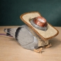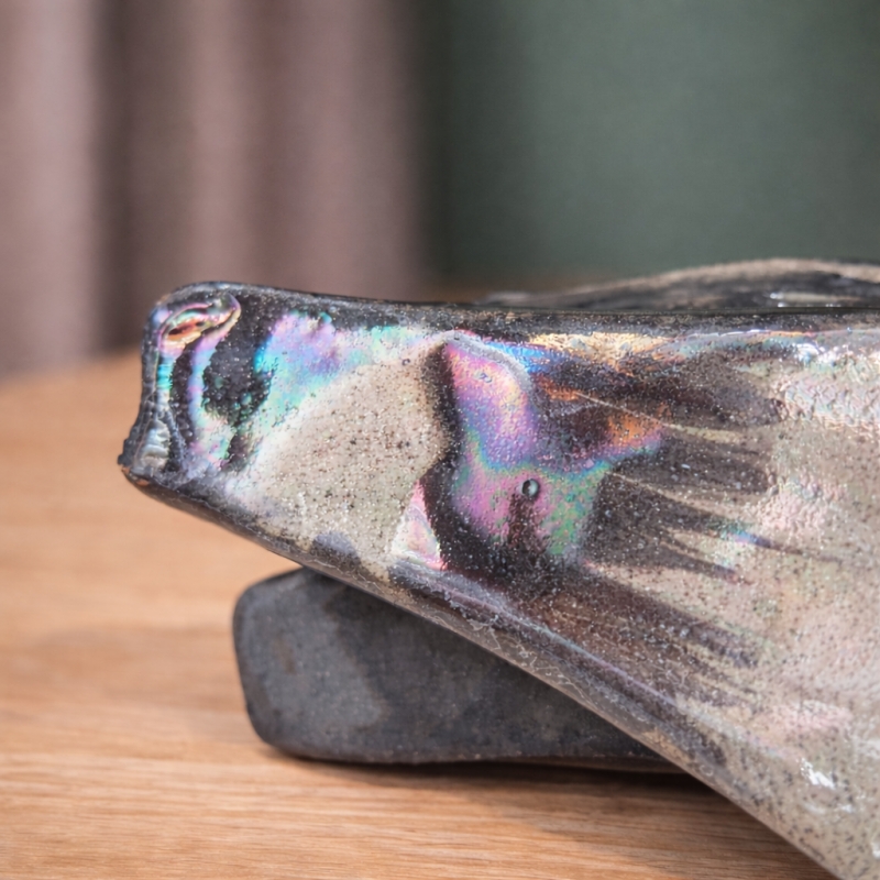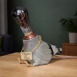 Ręcznie lepiona i szkliwiona lampa z typowym dla mnie żartem- lubię grę słów i rymy, dlatego gołąb nosi dumnie naszyjnik "BREAD OR DEAD". Głowa, szyja i końcówki skrzydeł pokryte lustrami, co daje efekt delikatnej, tęczowej poświaty.