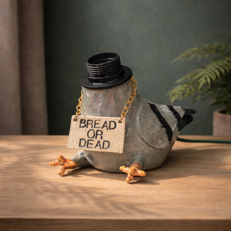Ręcznie lepiona i szkliwiona lampa z typowym dla mnie żartem- lubię grę słów i rymy, dlatego gołąb nosi dumnie naszyjnik "BREAD OR DEAD". Głowa, szyja i końcówki skrzydeł pokryte lustrami, co daje efekt tęczowej poświaty.
